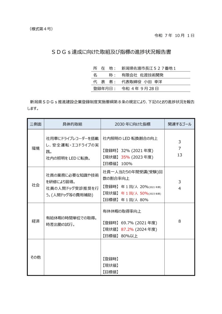 当社では以下の項目をはじめとする指標を定め、積極的に持続可能な開発目標(SDGs)を推進します。 環 境 社用車にドライブレコーダーを搭載し、安全運転・エコドライブの実践。 FSC認証製品(コピー用紙)の利用。 社内の照明をLEDに転換。 社 会 社員の業務に必要な知識や技術を研修により習得。 経 済 有給休暇の時間単位での取得。 時差出勤の試行。